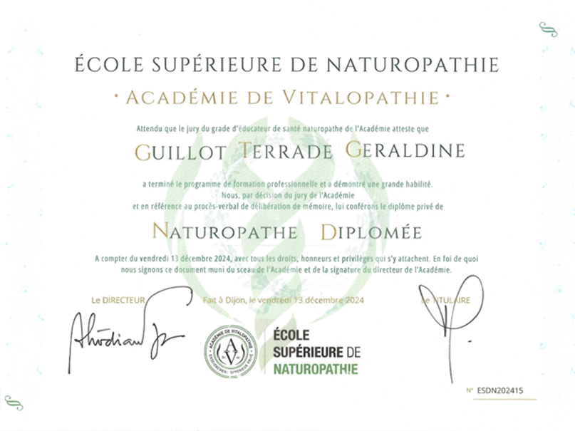 Parallèlement, j'ai eu la chance d'intégrer l'Ecole Supérieure de Naturopathie de DIJON, affiliée FENA, gage de contenus scientifiques approfondis et reconnue par le Rectorat, sur la base de 2200 heures de formation réalisées en présentiel. Médecins spécialistes, ostéopathes, infirmiers, psychologues étaient les formateurs de ce bachelor.