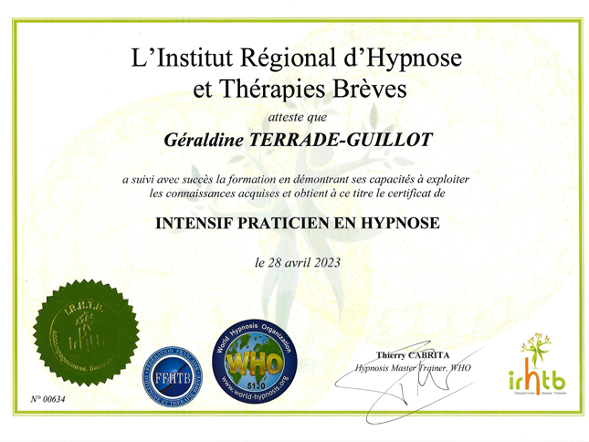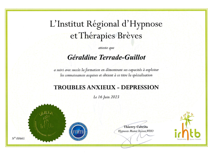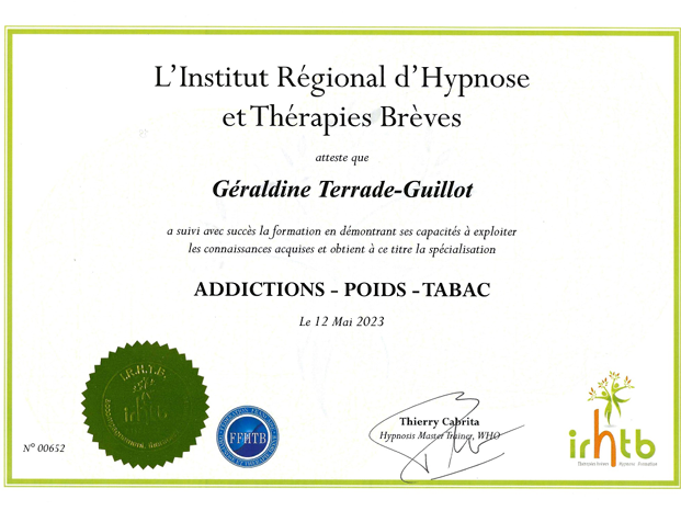 Une formation solide au sein de l'Institut Régional en Thérapies Brèves et Hypnose, orientée sur la gestion des émotions, la prise en charge de la douleur, la gestion du poids, les addictions, a accompagné mon quotidien professionnel.